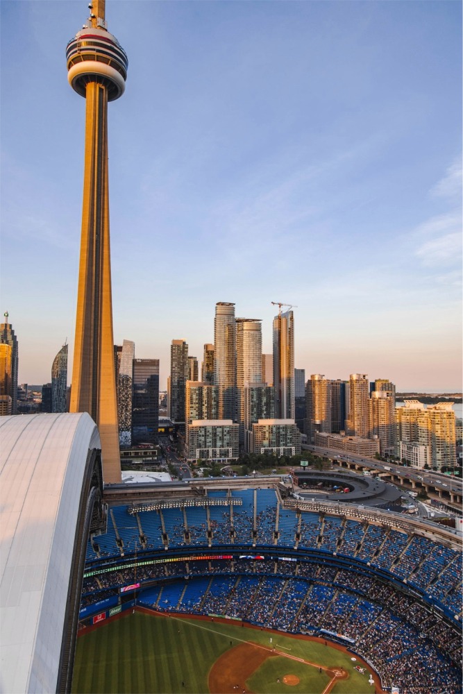 This is a photograph of a baseball game at the Rogers Centre in Toronto, Ontario, Canada. There is a lovely view of the CN Tower behind the Rogers Centre.