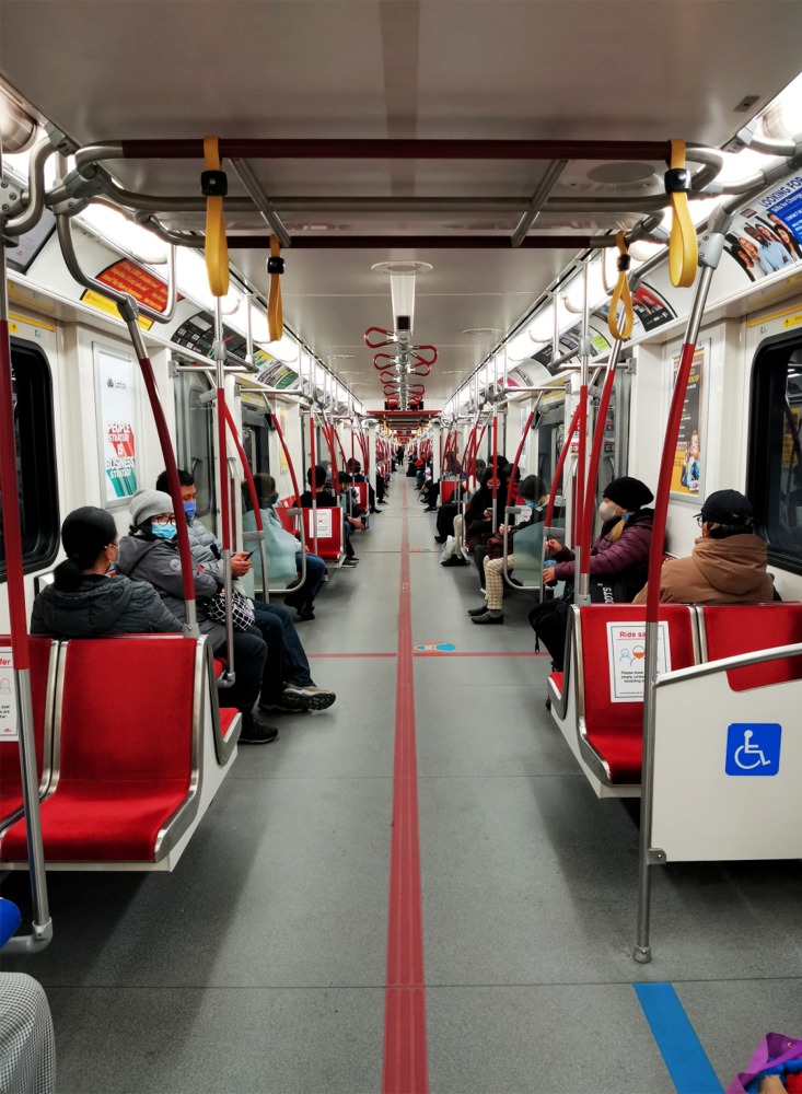 This is a photograph of a Flexity Outlook (current generation [2022]) streetcar / tram interior in Toronto, Ontario, Canada.