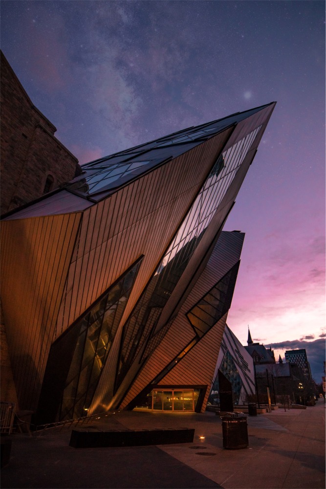 This photograph is of the Royal Ontario Museum in Toronto, Canada. The photo features the Michael Lee-Chin Crystal at sunset.