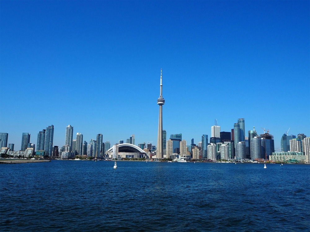 Photograph of the Toronto skyline with Lake Ontario in the foreground. It is a bright sunny day — Roger's Centre and the CN Tower feature in the middle of the image.