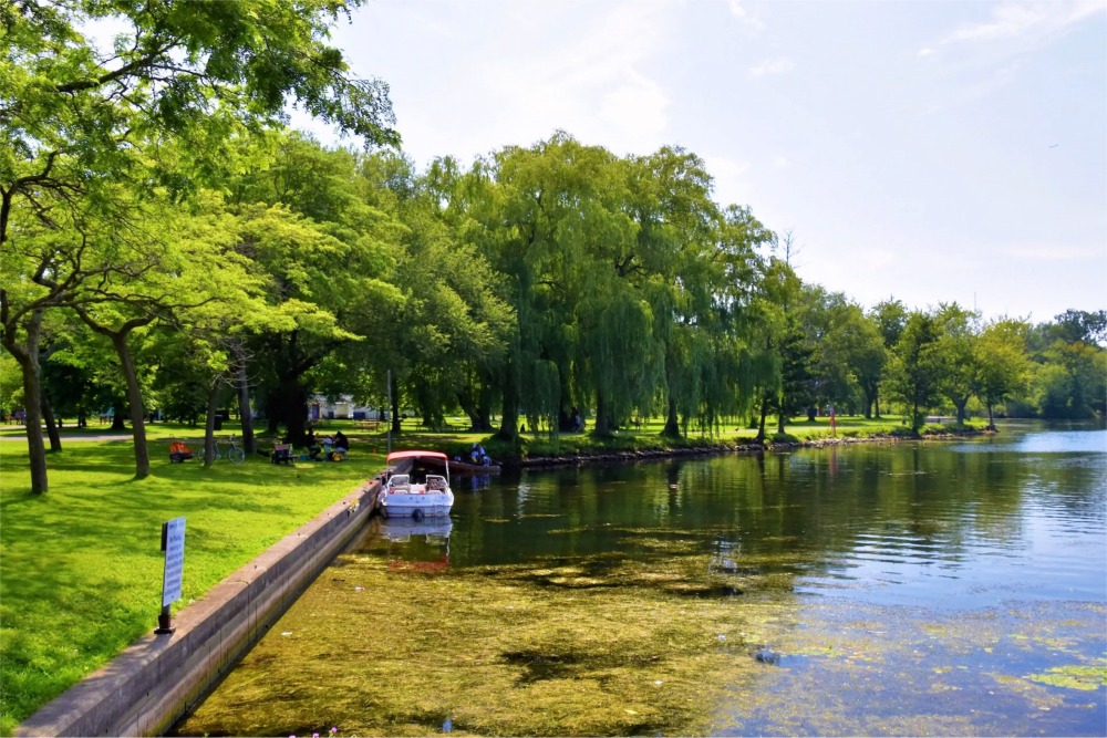 Photograph from the park on Centre Island, Toronto, Ontario, Canada. We see a pleasure craft moored in the pond.