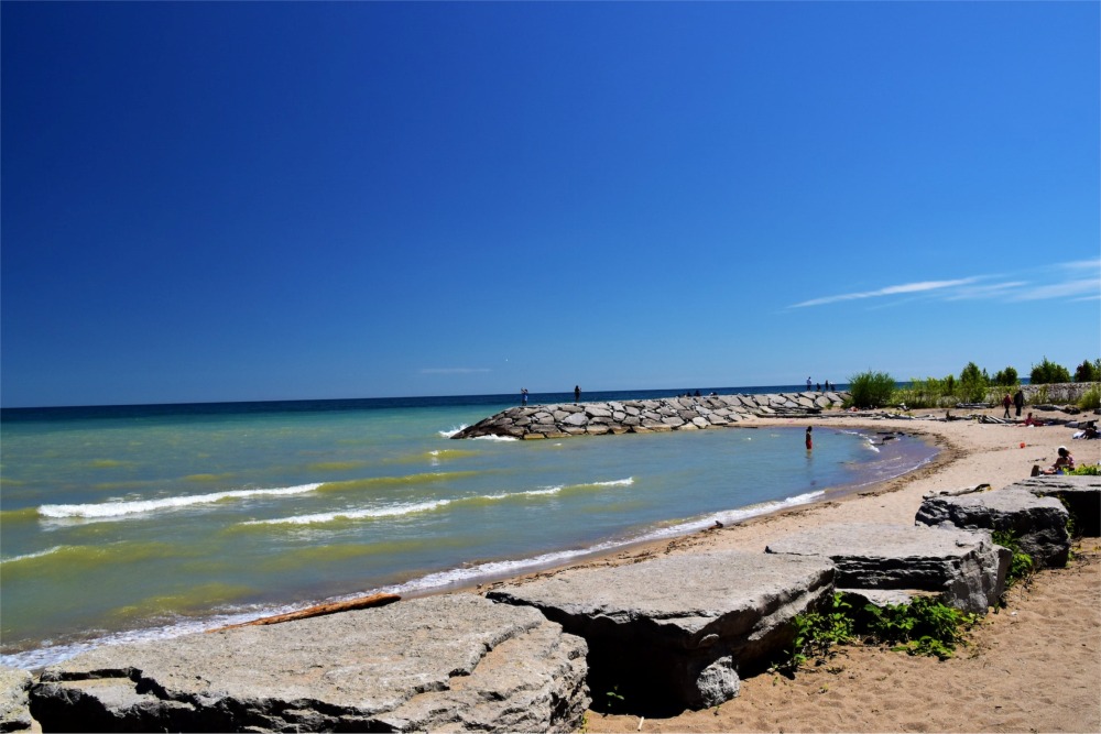 Photograph of people walking at the beach of Lake Ontario in the Rouge National Urban Park, Toronto, Ontario, Canada.