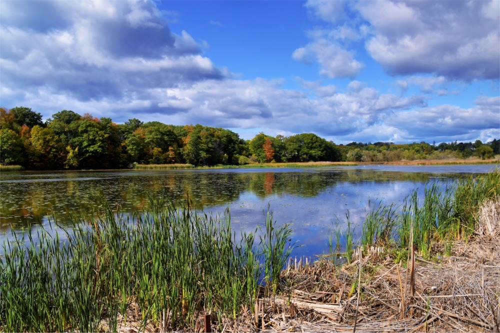 Photograph taken on a bright sunny day showing trees and a body of water in the Rouge National Urban Park, Toronto, Ontario, Canada.