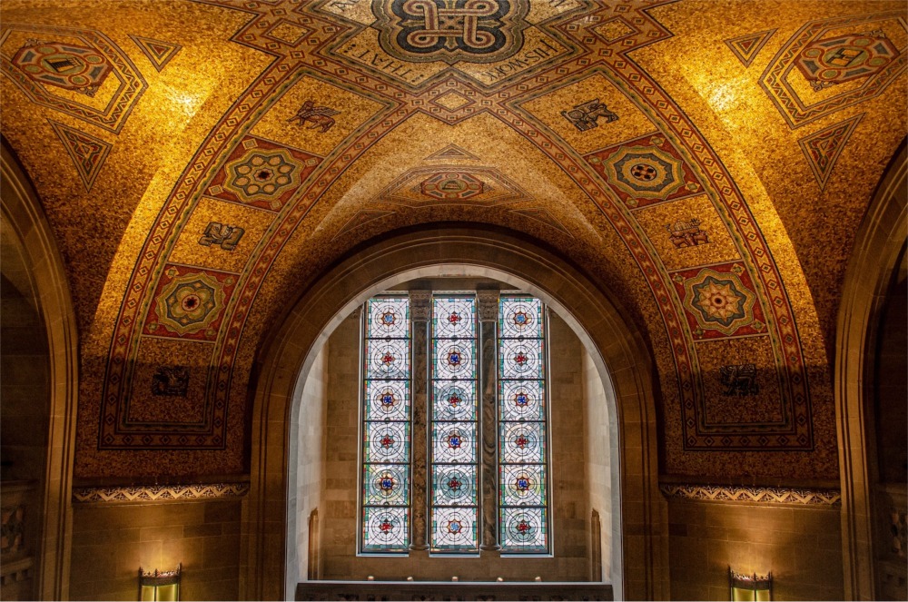 More than a million stained Venetian glass tiles cover the spectacular mosaic ceiling of the Queen's Park entrance at the Royal Ontario Museum in Toronto, Canada.
